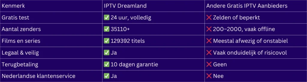 Wanneer je op zoek bent naar gratis IPTV die stabiel, legaal en rijk aan content is, hoef je niet verder te zoeken dan IPTV Dreamland. In tegenstelling tot veel dubieuze gratis IPTV-bronnen, biedt IPTV Dreamland een volledig transparante én betrouwbare oplossing. Met een 24-uur durende gratis IPTV test, 10 dagen niet-goed-geld-terug garantie én een gigantisch aanbod aan zenders en video’s, onderscheidt deze aanbieder zich ruimschoots van de concurrentie.