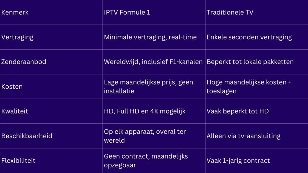 De onderstaande tabel geeft een duidelijk overzicht van enkele van de bekendste IPTV-aanbieders in Nederland die geschikt zijn voor iptv formule 1, inclusief hun unieke kenmerken.
