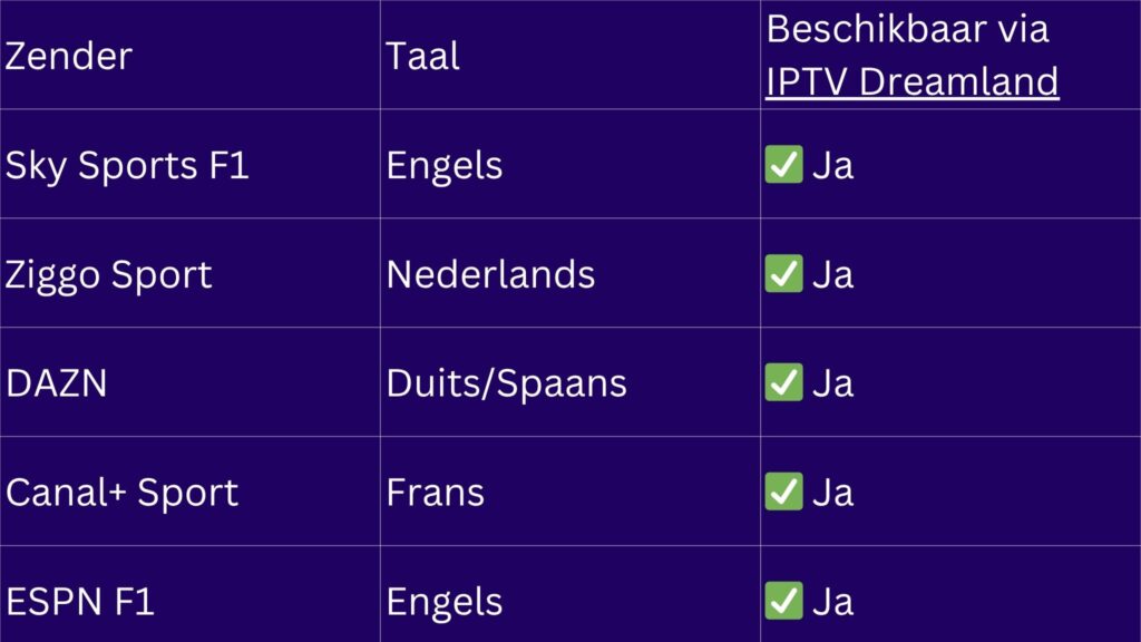 Niet elke IPTV-provider biedt automatisch toegang tot internationale Formule 1-kanalen. Let erop dat de volgende zenders aanwezig zijn: